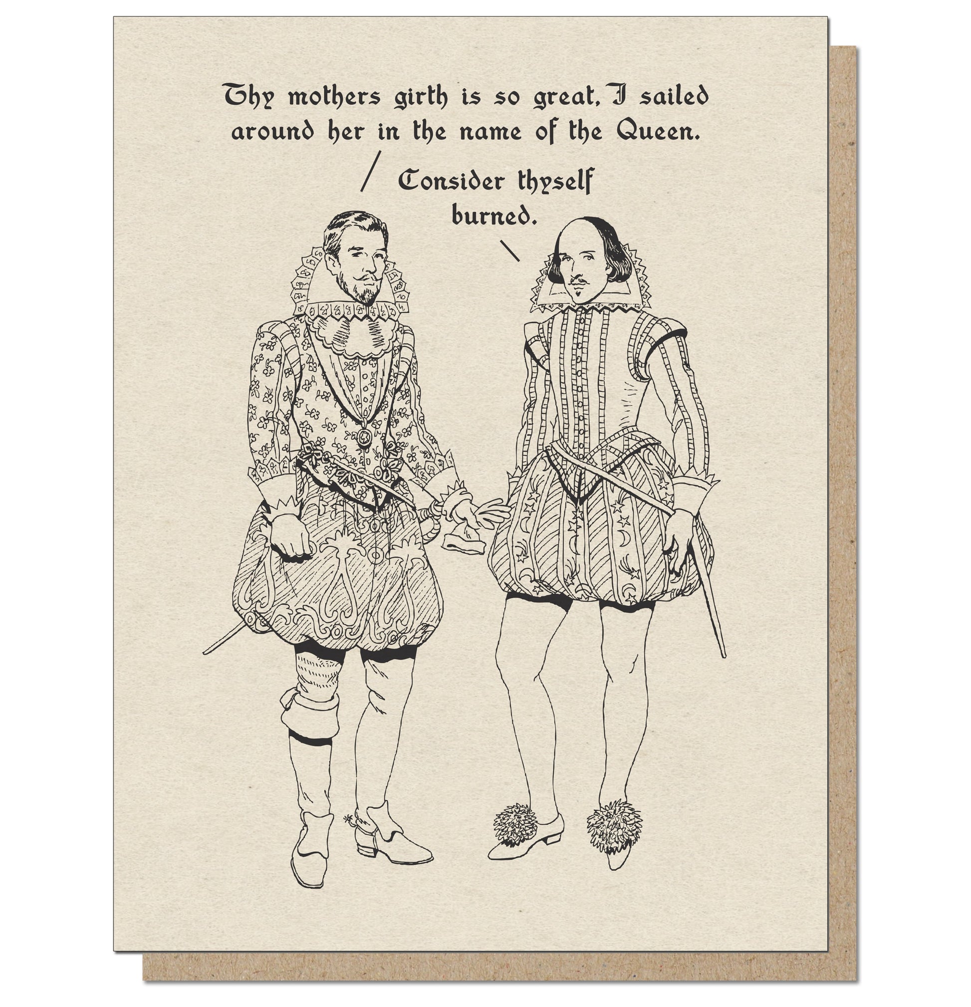 Thy mother's girth is so great, I sailed around her in the name of the Queen. Consider thyself burned.