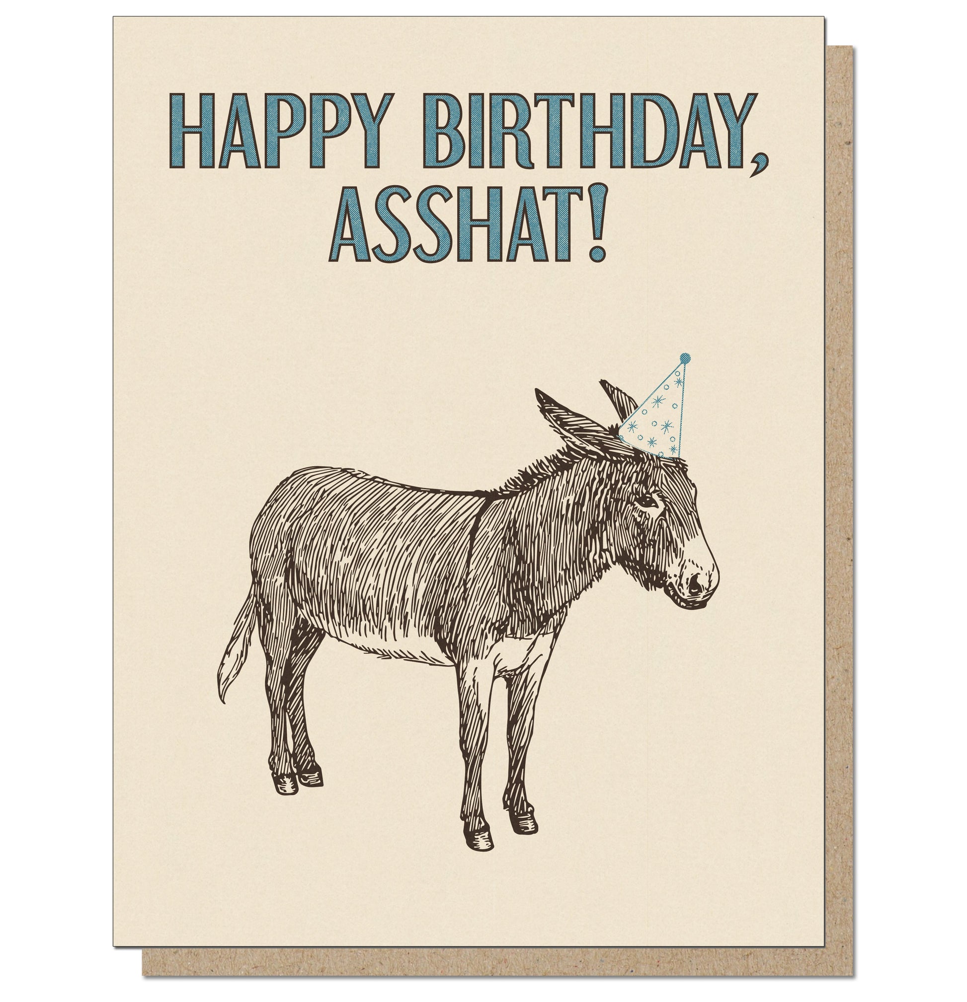 "Happy Birthday, Asshat!" Donkey in a party hat!