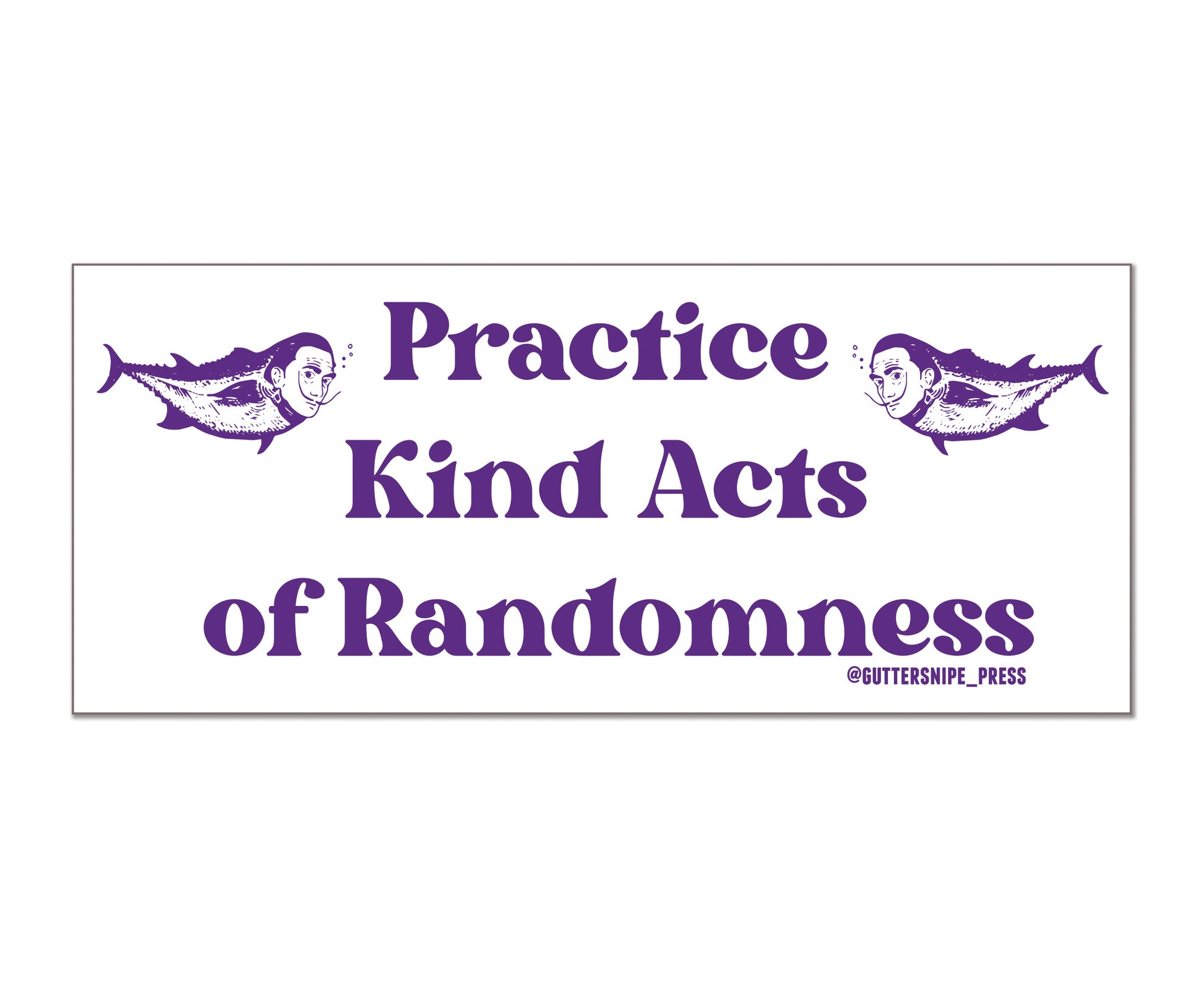 Traditional small bumper sticker size. Practice Kind Acts of Randomness. Yeah, that's a fish with a Salvador Dali head, what? Purple on white. Peace through Absurdity!