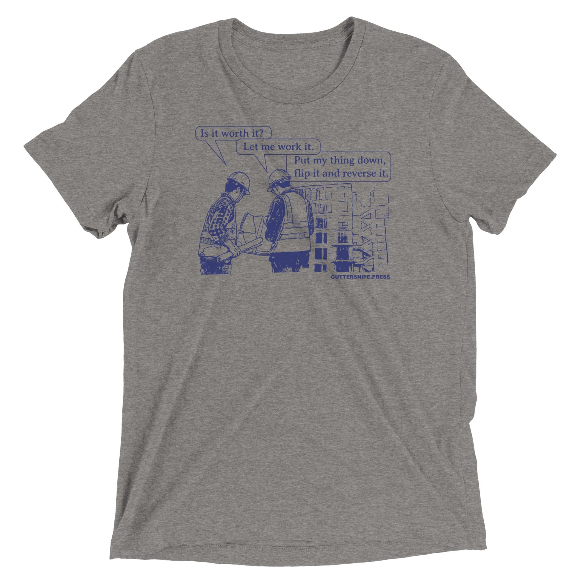 Is It Worth It? Let Me Work it Available in Grey, Tan, Oatmeal, White Fleck and Solid White, this tri-blend fabric creates a vintage, fitted look. And extreme durability makes this t-shirt withstand repeated washings and still remain super comfortable.